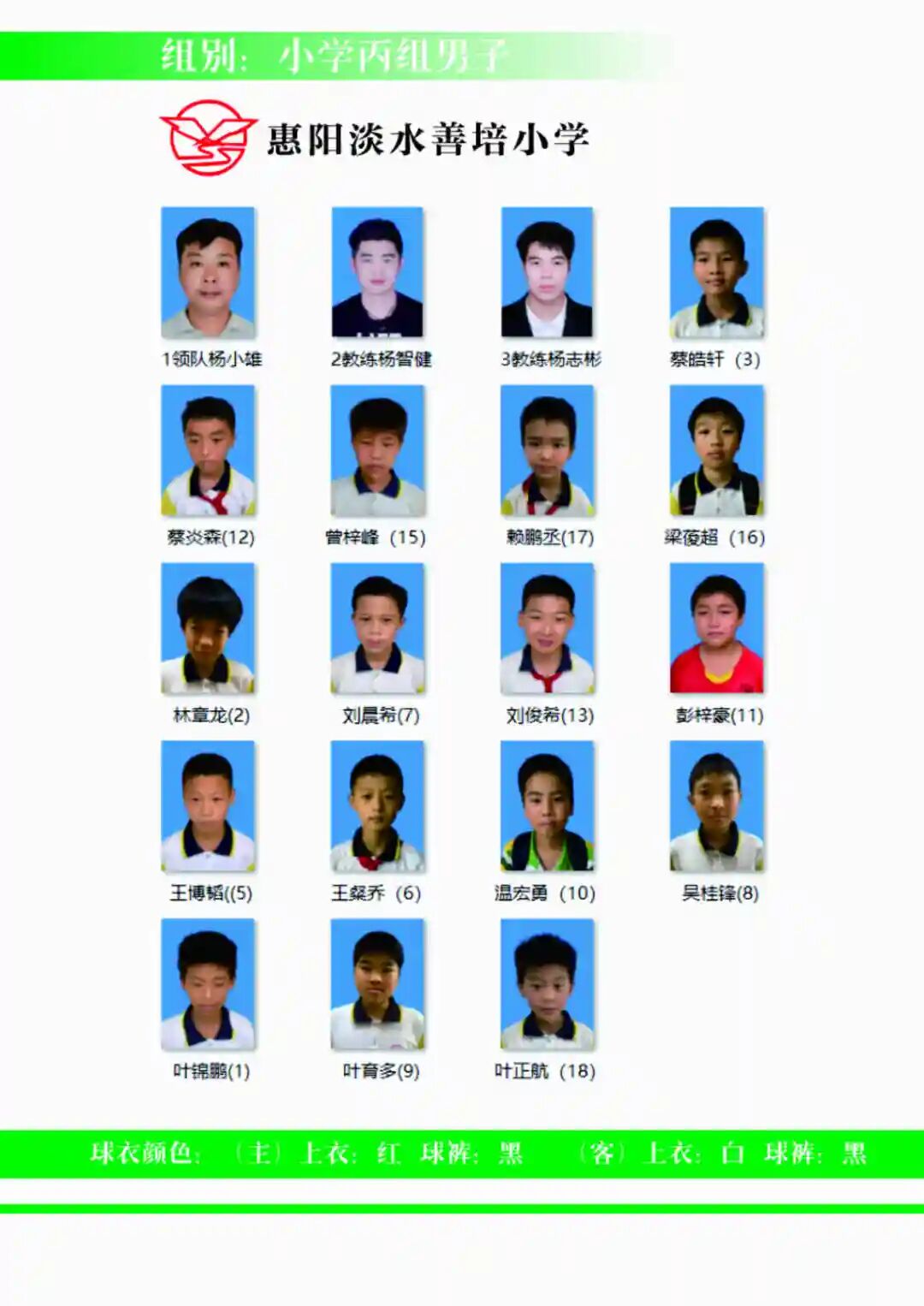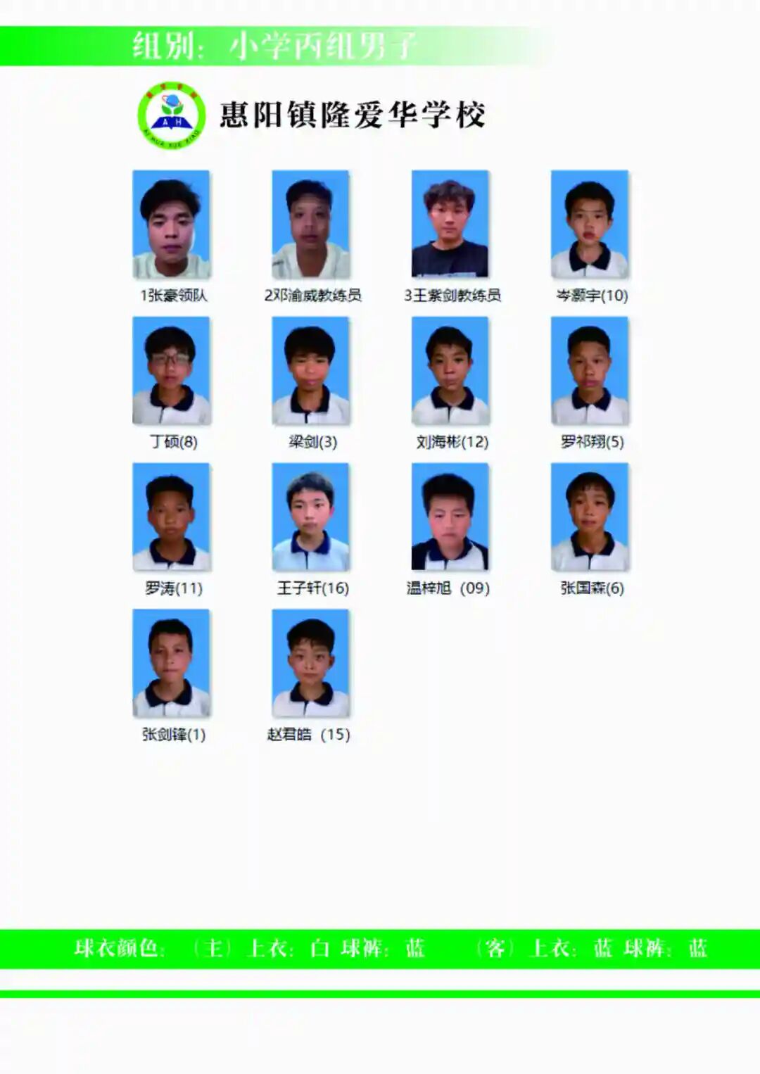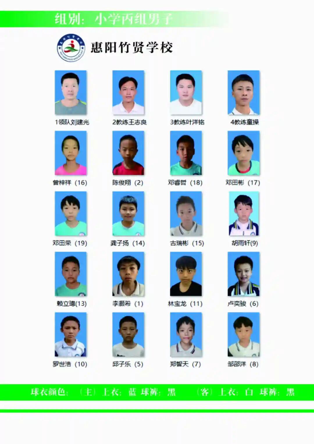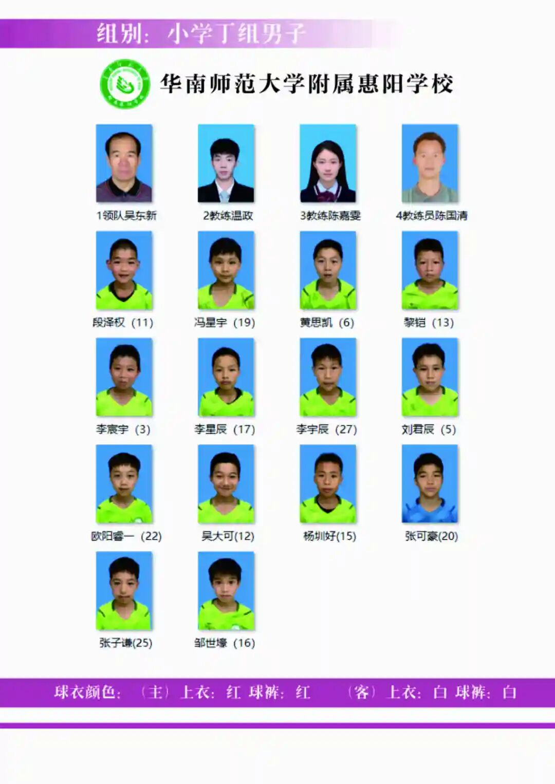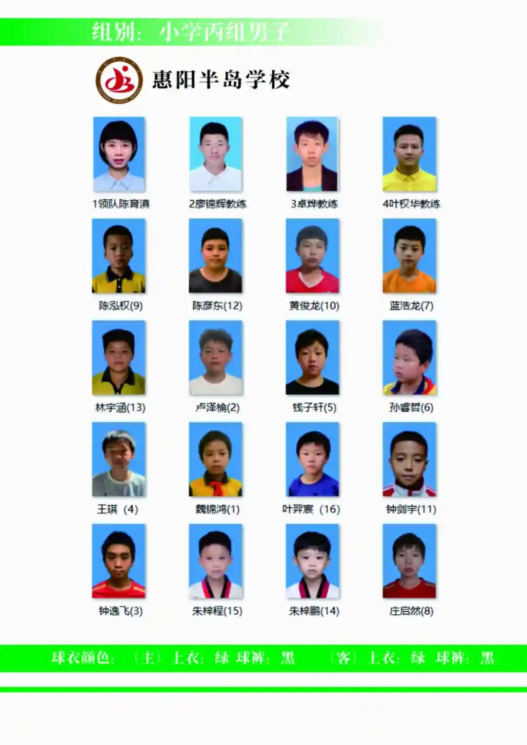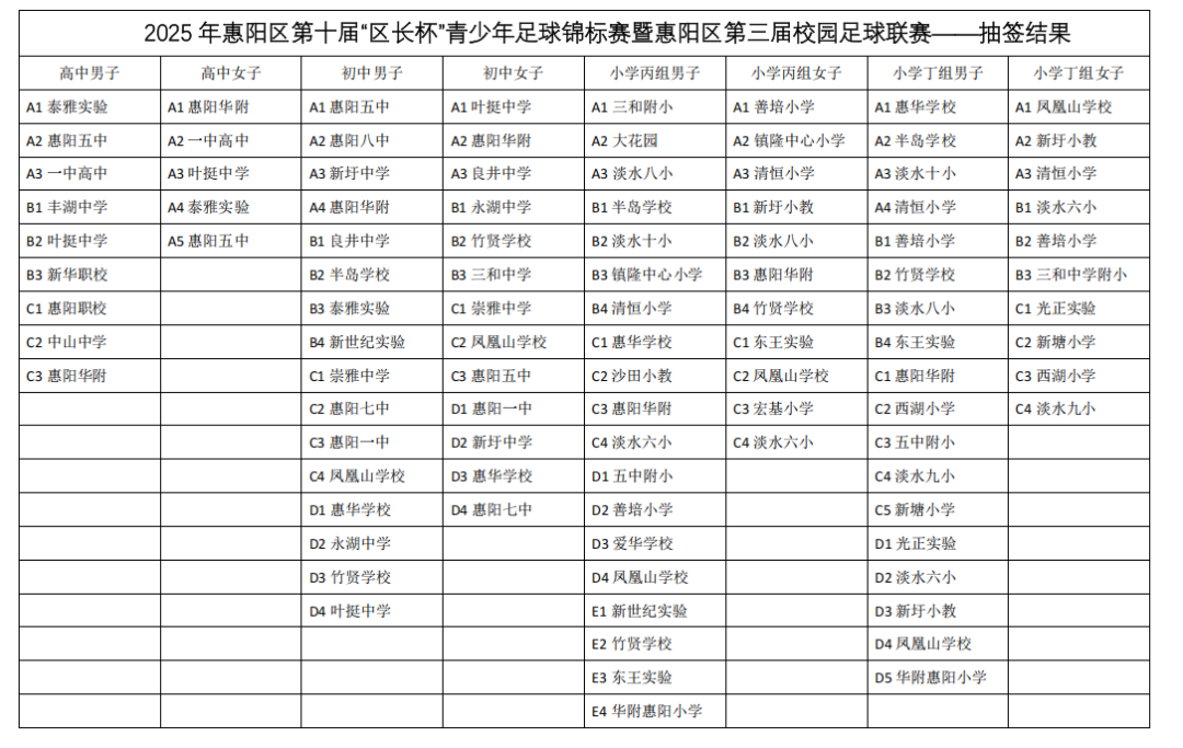 赛事简介:惠阳“区长杯”青少年足球锦标赛简称惠阳“区长杯”足球赛,是由惠阳区文化广电旅游体育局、惠阳区教育局主办,惠阳区足球协会承办的全区中小学一年一度的校园足球赛事。参赛单位来自区各中学、各中心小学、直属学校等,是惠阳目前青少年足球覆盖范围最广、规格最高的足球锦标赛事。赛事完美对接了惠州市“市长杯”、广东省“省长杯”校园足球赛。2016年的第一届举办至今,“区长杯”赛事已经走过了10年的历程,队伍数量也从最初的19支增加到101支,“千里之行始于足下”,每一届参赛人数的增长、赛事规模的扩大,都印证了这些年惠阳青少年足球的稳固发展,这些成果离不开上级领导部门的重视和指导。也都离不开社会各界人士对惠阳青少年足球的关注和支持。 为确保本届赛事顺利举行,赛前召开了领队教练员赛前联席会议、裁判员培训会议,会议结束后各组别进行了抽签分组。 左右滑动查看 左右滑动查看其余队伍(共18支队伍)