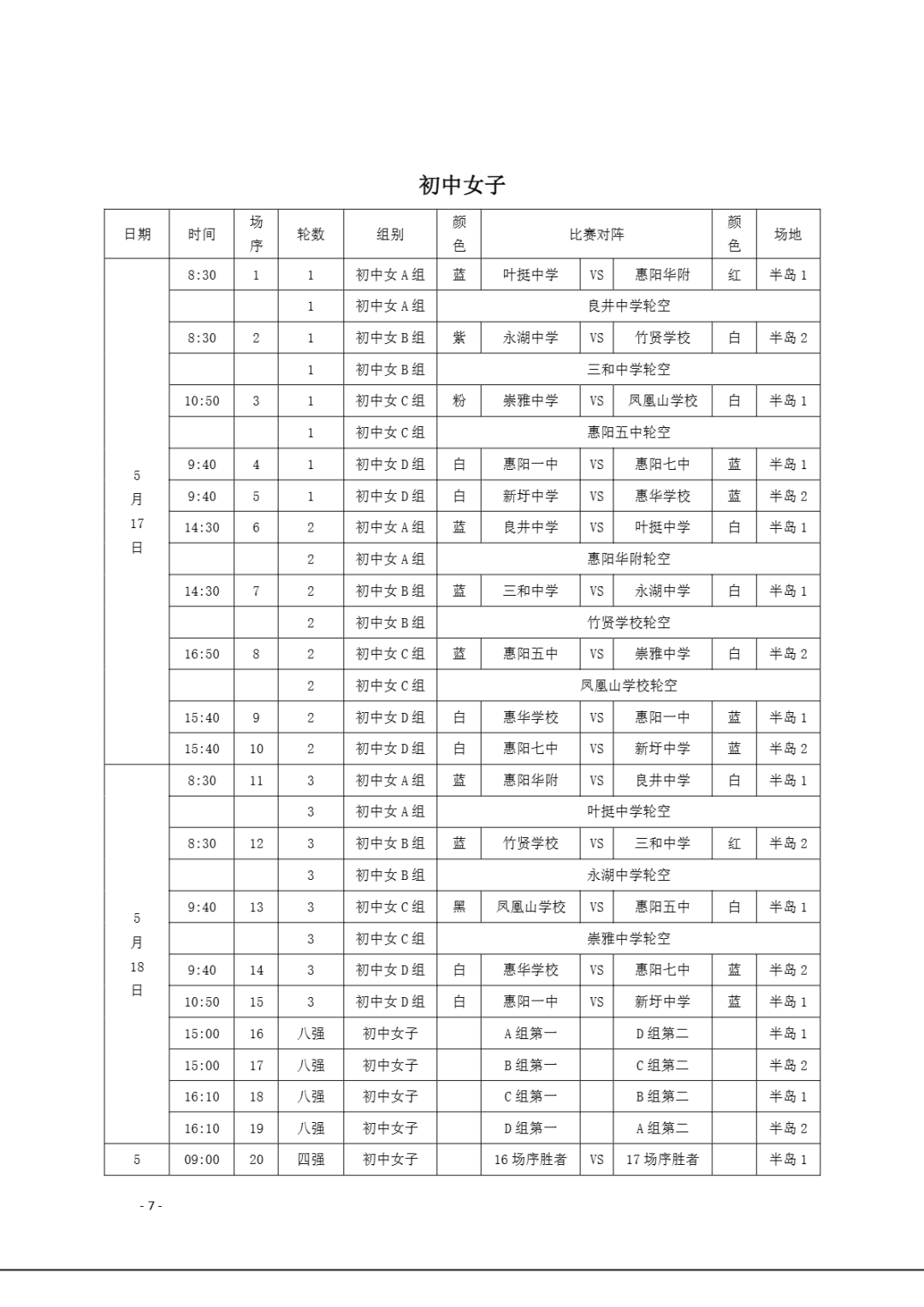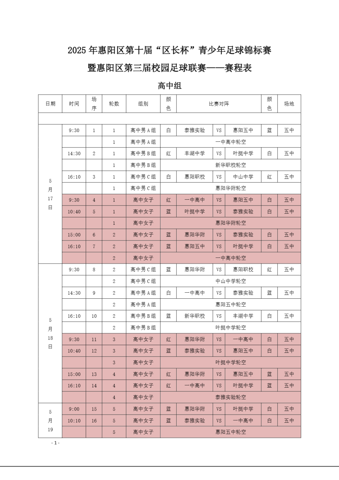5月17日,惠州市惠阳区第十届“区长杯”青少年足球锦标赛暨惠阳区第三届校园足球联赛开赛,本次比赛分为8个组别,分别为高中甲组(男女)、初中乙组(男女)、小学丙组(男女)、小学丁组(男女),来自全区42所学校派出的101支队伍、共计1369名运动员、约300名领队教练,整个赛事跨度10天,将分别在2个赛场进行216场比赛。