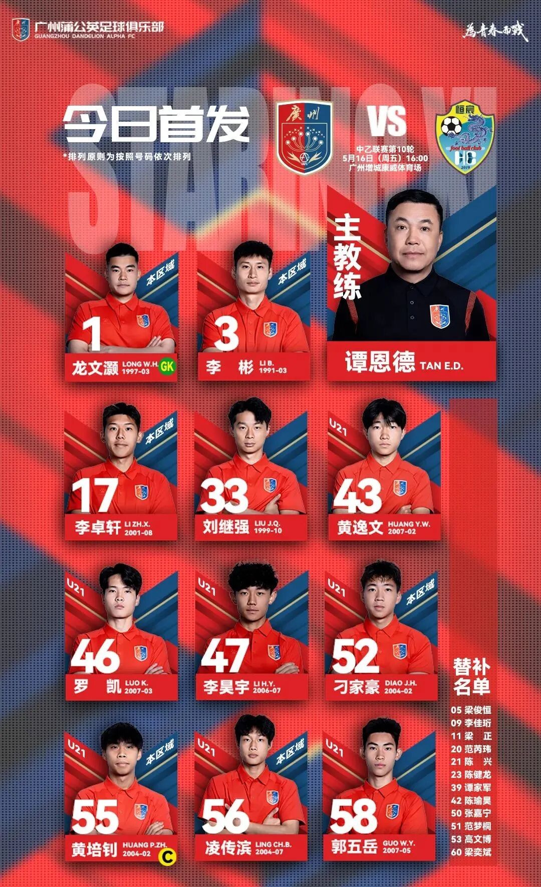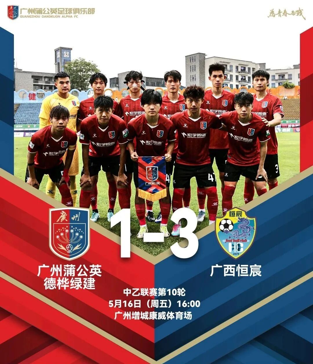 5月16日16:00,2025华润饮料中国足球乙级联赛第十轮广州蒲公英德桦绿建队主场对阵广西恒宸的比赛在广州增城康威体育场进行。梁奕斌破门,广州蒲公英德桦绿建队1-3不敌广西恒宸队。
