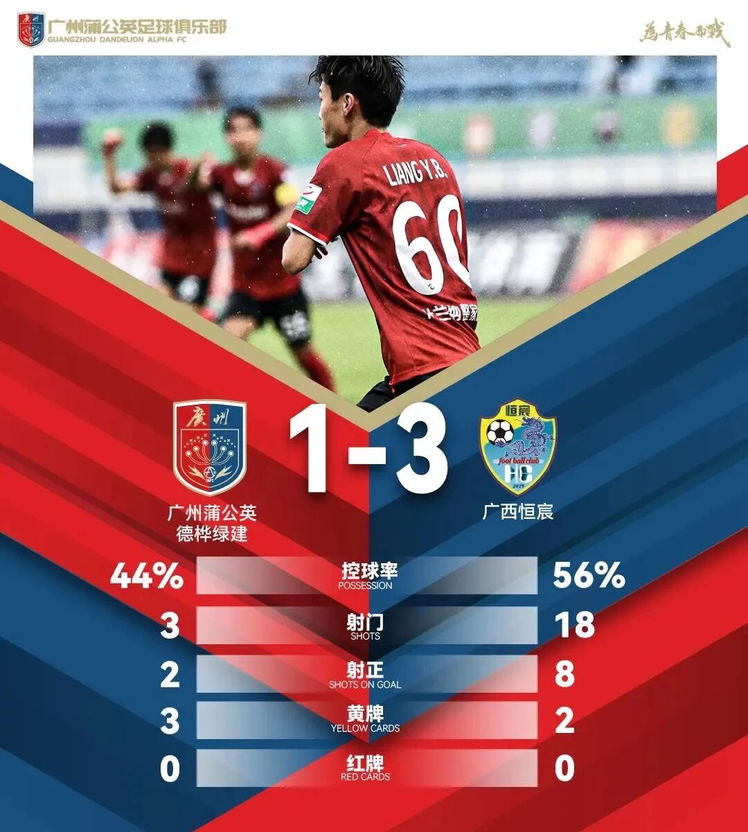 上半场第45分钟,梁奕斌利用对方守门员传球失误远射破门,下半场广西恒宸队连扳三球,最终比赛结束广州蒲公英德桦绿建队1-3主场不敌广西恒宸队。
