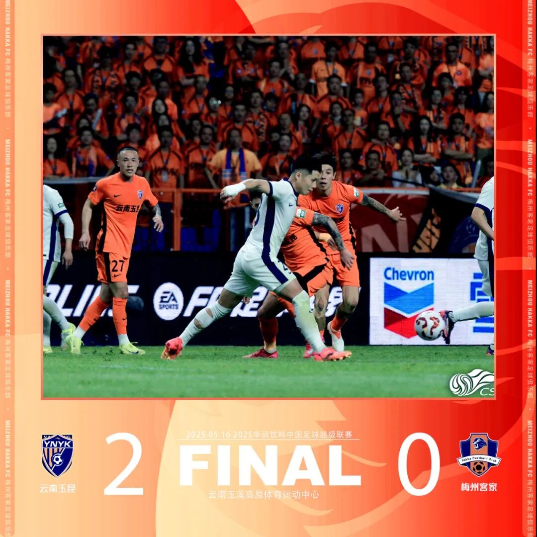 北京时间5月16日20:00,2025华润饮料中国足球超级联赛第13轮比赛,梅州客家做客云南玉溪高原体育运动中心对阵云南玉昆。凭借第19分钟约尼查、第48分钟叶楚贵进球,梅州客场0-2负于云南。