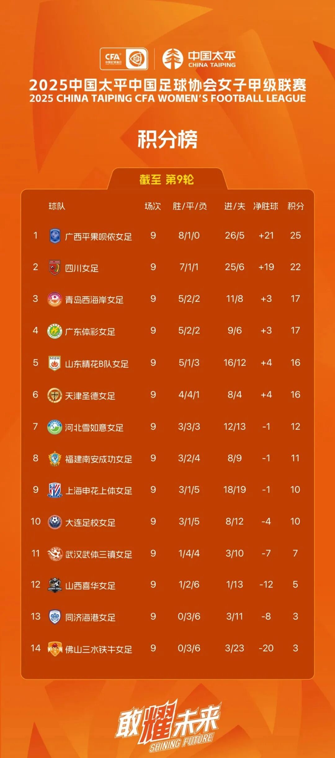 本轮过后,广东体彩女足5胜2平2负积17分排名第四位。