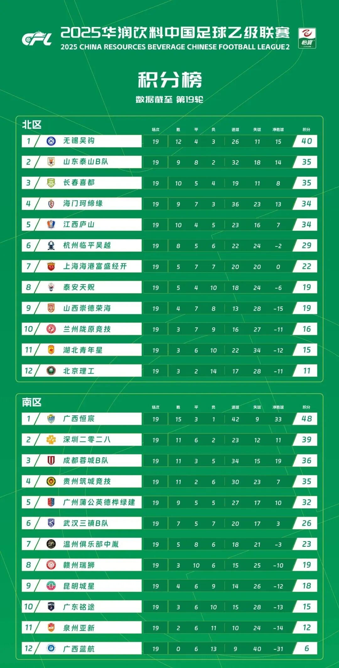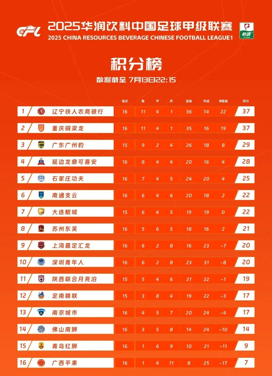 本轮过后,广东铭途3胜6平10负积15分排名南区第十位。