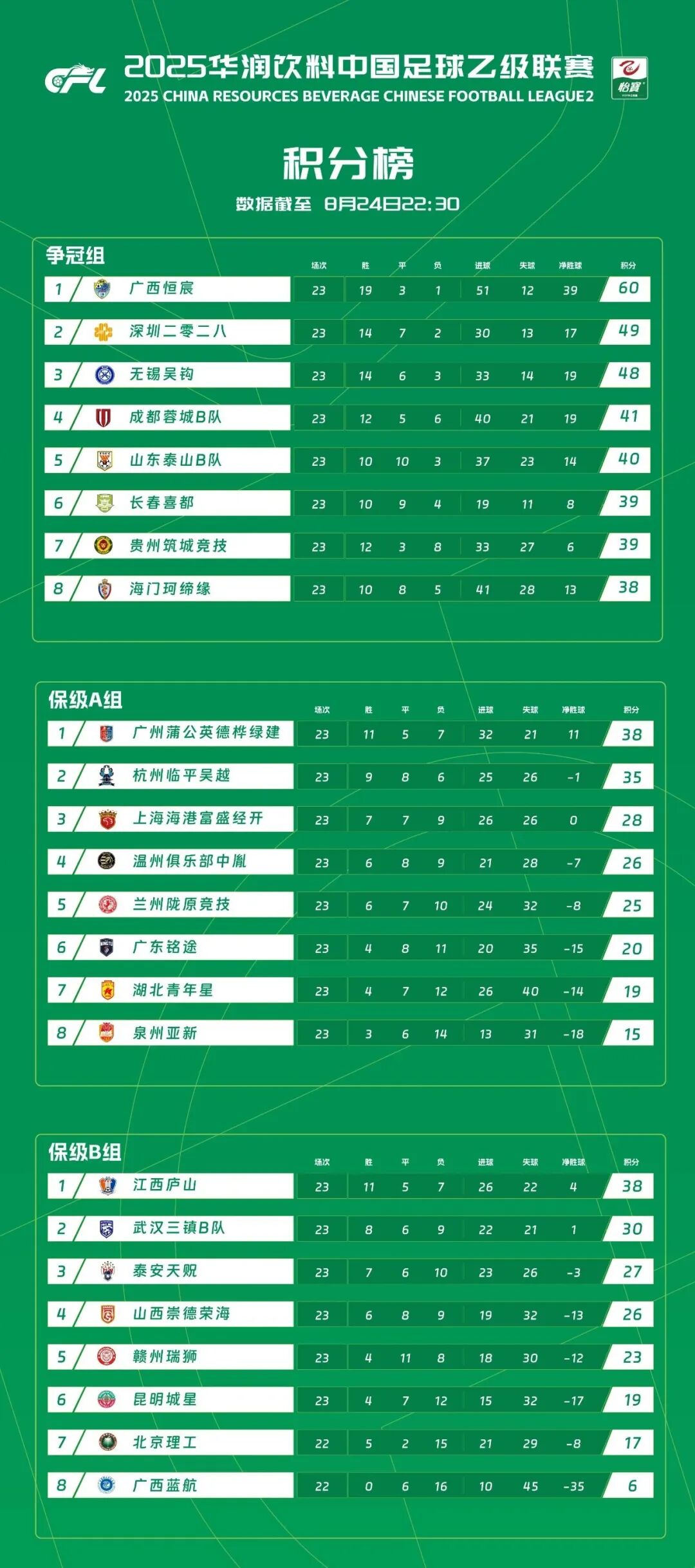 中乙23轮过后,广州蒲公英11胜5平7负积38分在保级A组中排在第一位。