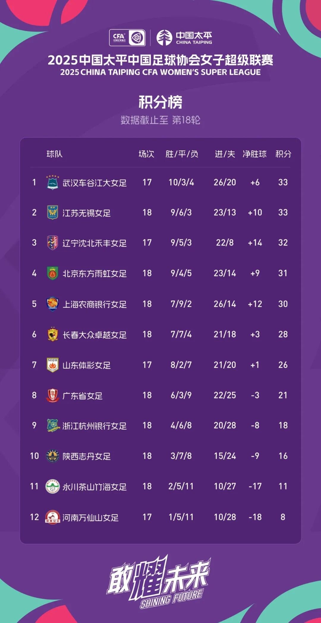 女超18轮过后,广东省女足6胜3平5负积21分排在第八位。