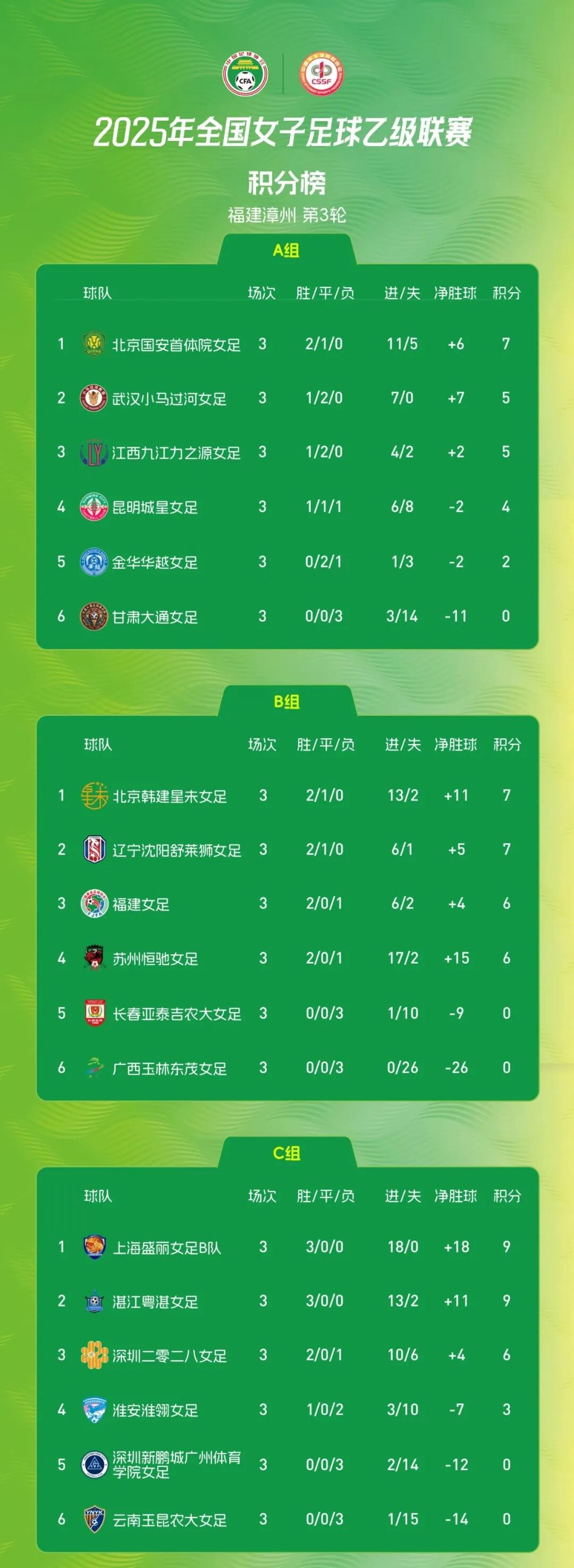 女乙3轮过后,湛江粤湛女足在C组3连胜排名第二位,深圳新鹏城广体女足3连败排名第五位。