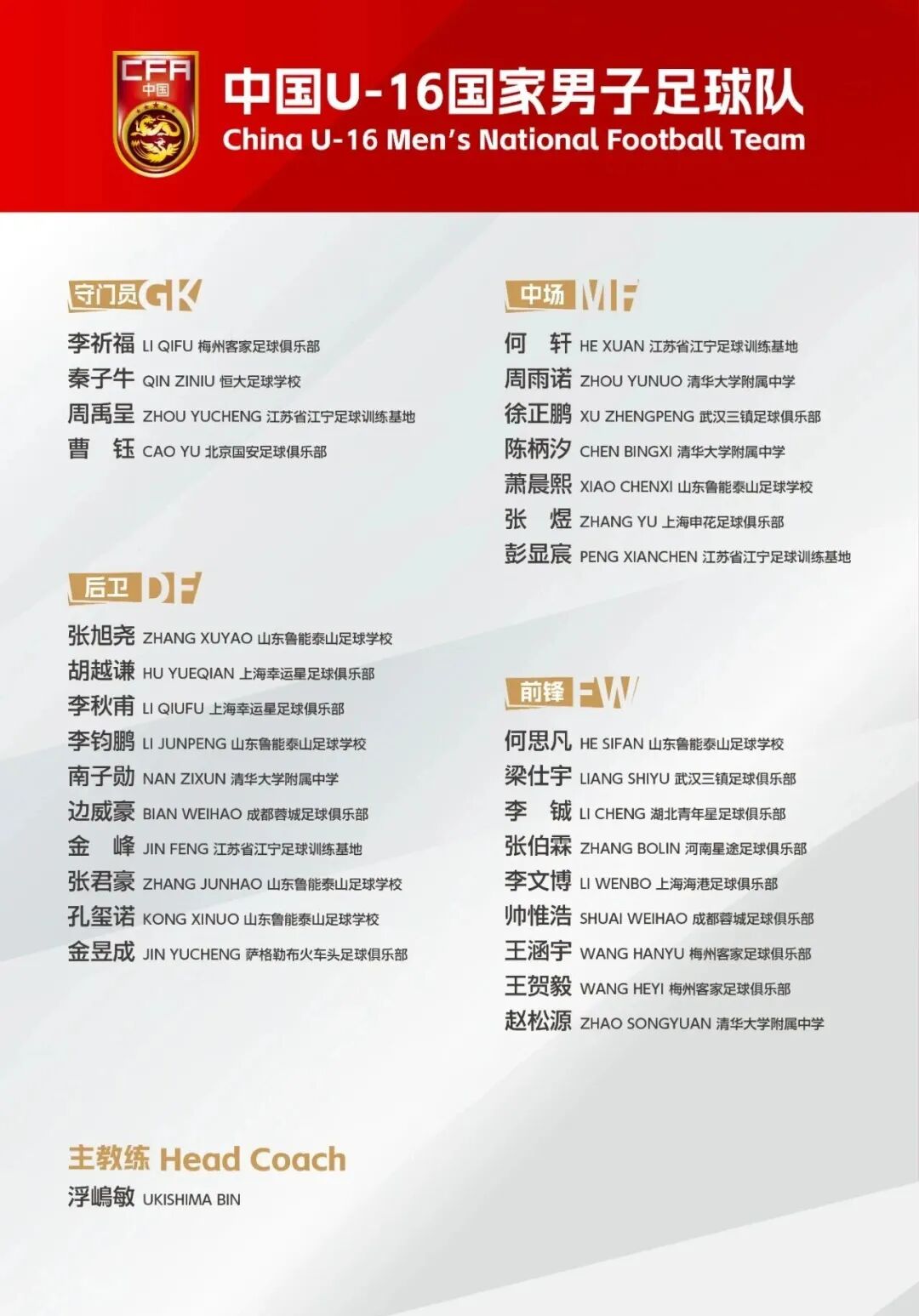U16国少集训名单公布,广东4人入选