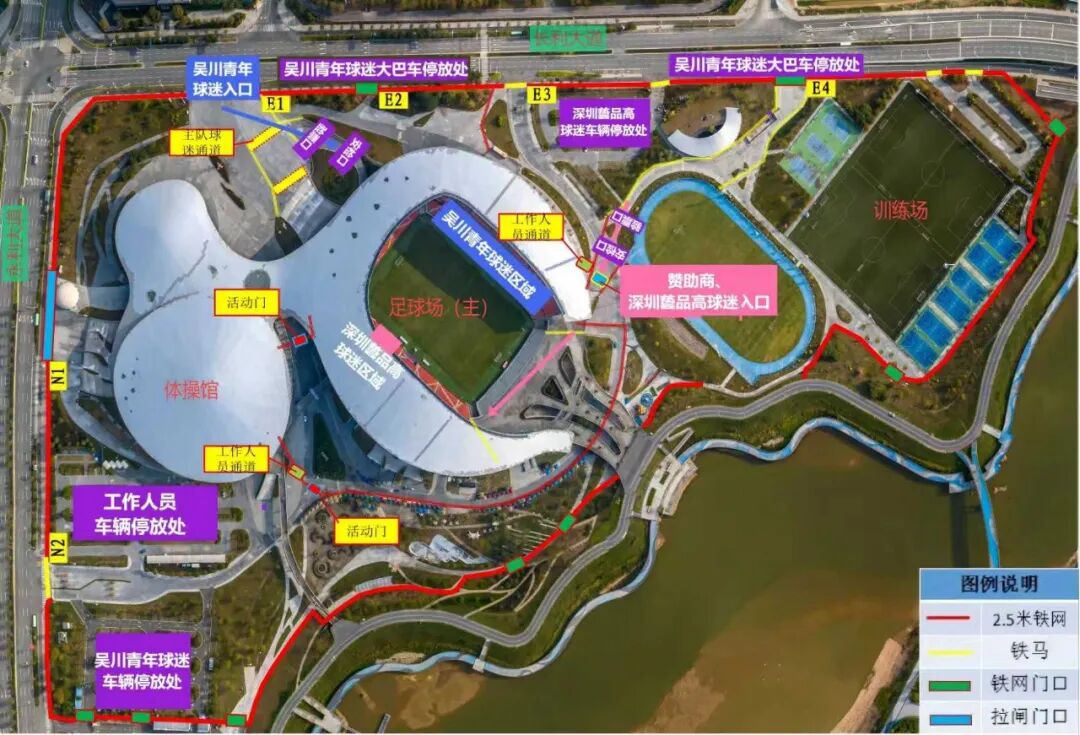 (一)紫色区域代表停车场,其中P4停车场为吴川青年球迷区,P2停车场为深圳藝品高球迷区,长利大道公路边为吴川青年大巴车区(入口处下车即走)。