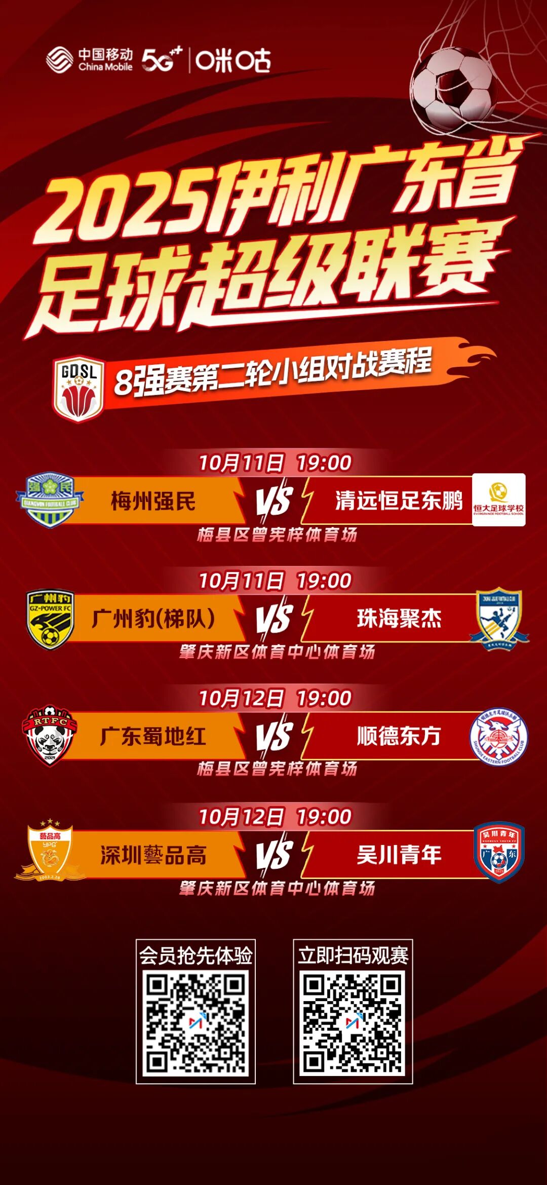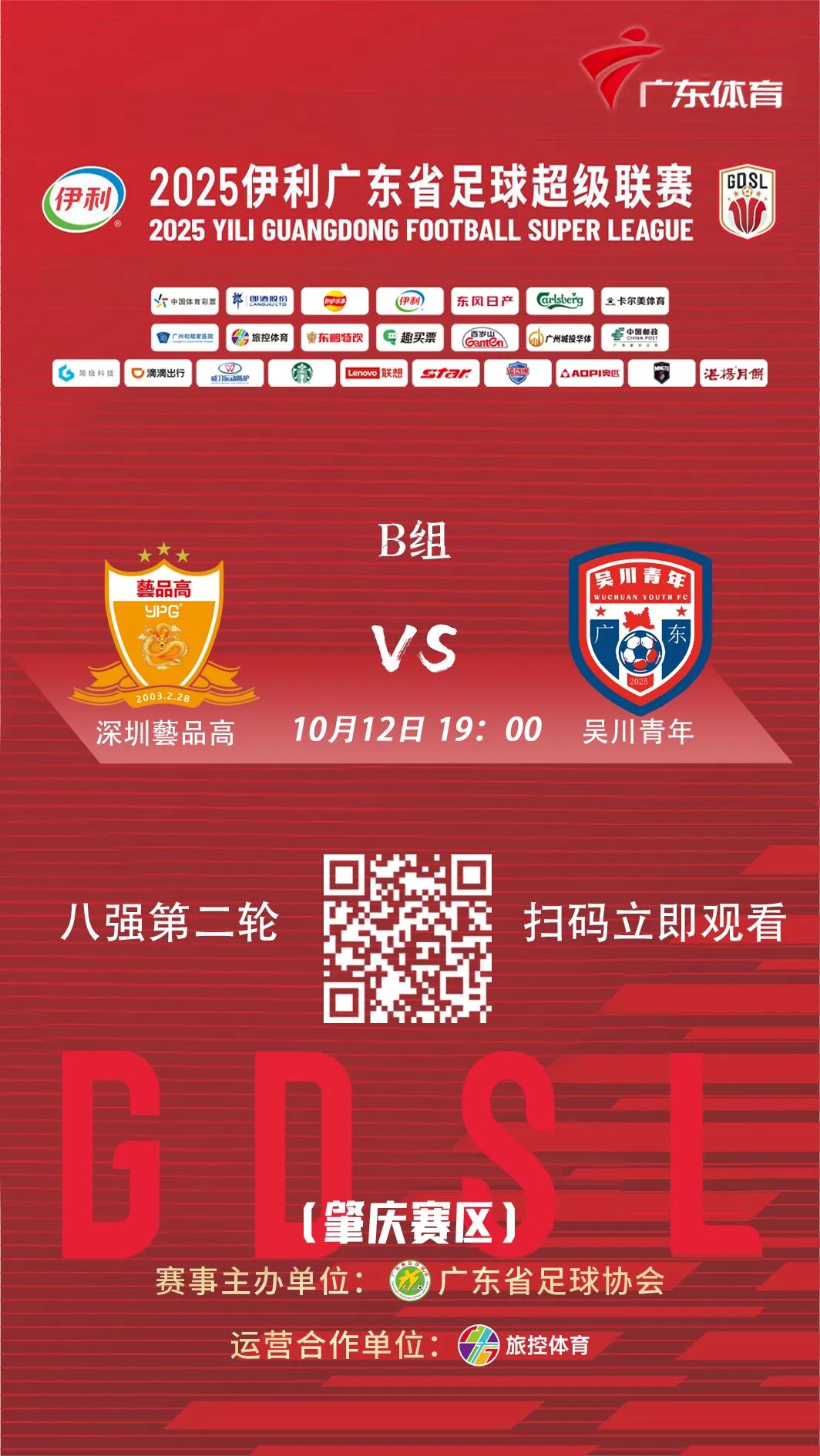 2025伊利广东省足球超级联赛(以下简称“省超”)正赛八强赛第二轮,将在肇庆新区体育中心体育场继续举行,10月12日19时由深圳藝品高对阵吴川青年,四强名额争夺战激情上演。