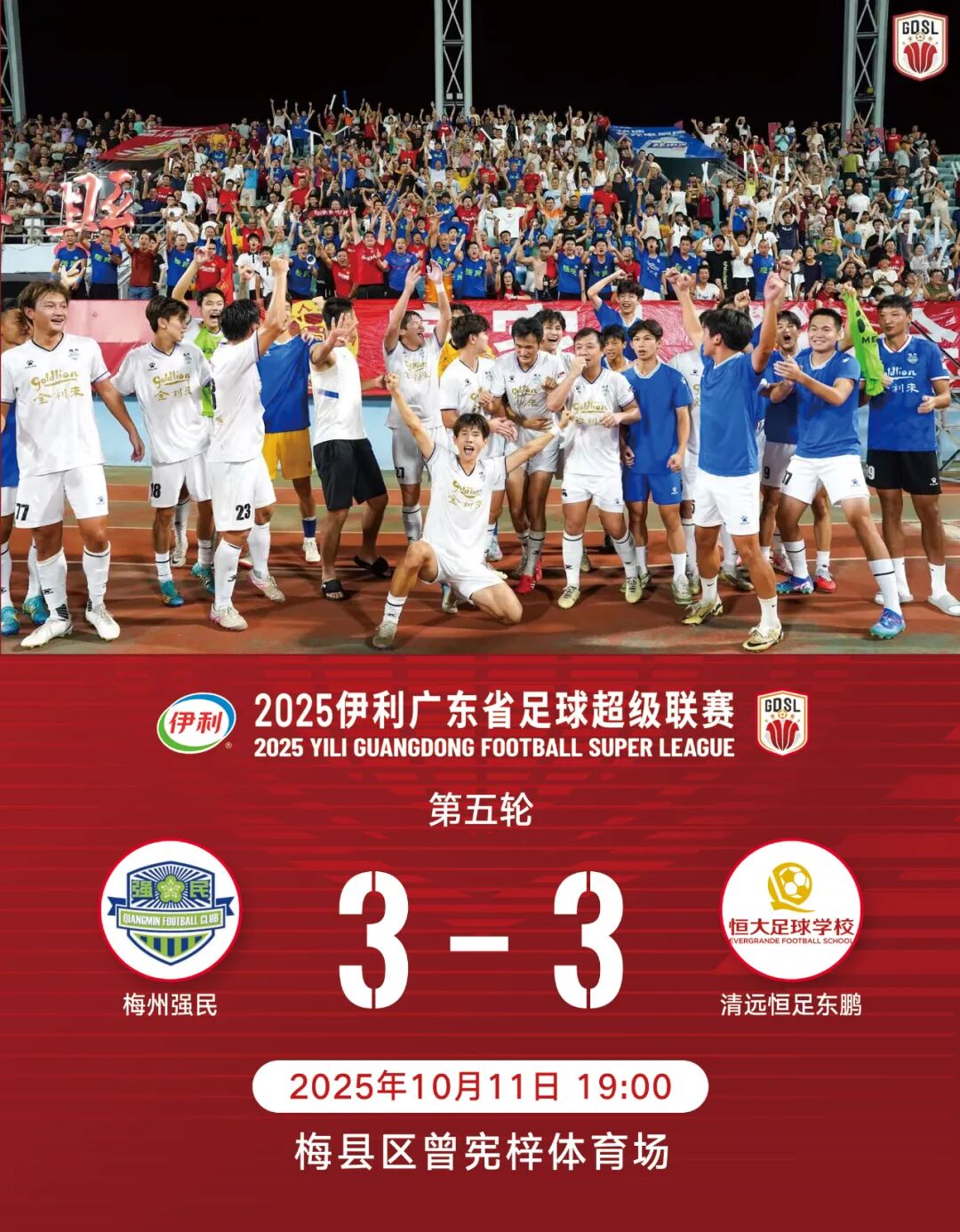 10月11日,2025伊利广东省足球超级联赛八强战第二轮开战,梅州强民补时绝平3-3战平清远恒足东鹏,拿到第二张四强门票。另外一场比赛,广东广州豹(梯队)4-1战胜珠海聚杰,能否获得四强资格则需看明天深圳藝品高与吴川青年赛果。