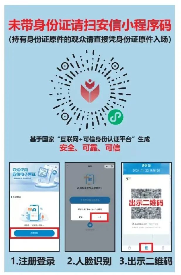 2. 无身份证处理:未携带身份证的观众,请扫描安信小程序码进行身份核验