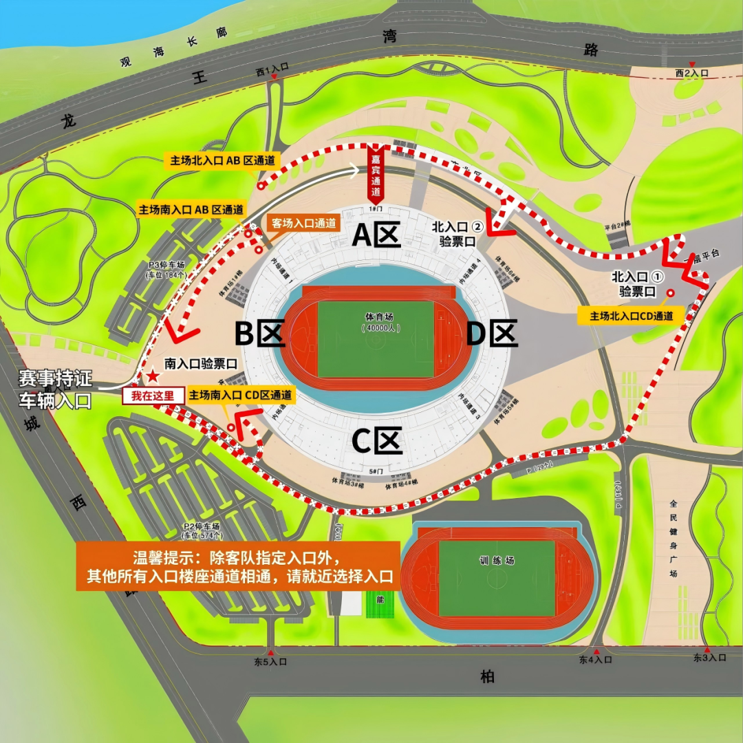 2. 除客队指定入口外,其他所有入口楼座通道相通,可就近选择入口