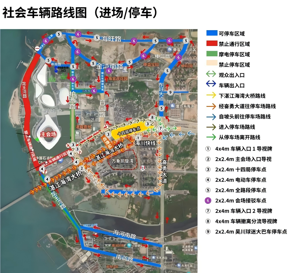 球迷自驾车可停放至综合馆外围空地及周边街道路面停车点,总停车泊位数量5564辆,具体路段及车位分布如下: