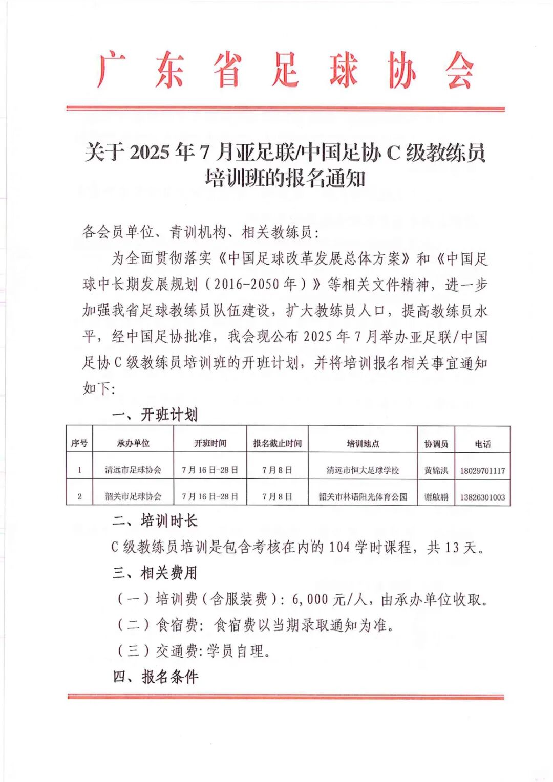 关于2025年7月亚足联/中国足协C级教练员培训班的报名通知