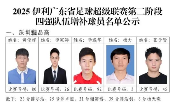 2025伊利广东省足球超级联赛第二阶段四强队伍增补球员名单